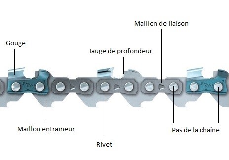 - Chaîne « semi-chisel » : elle est un mélange des deux types de chaîne présentés ci-dessus. Il reste un bon compromis en limitant le risque tout en restant efficient.